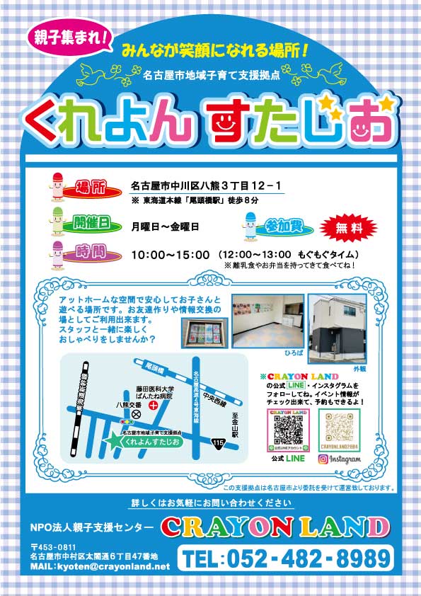 お知らせ HOME > お知らせ一覧 > 4月1日に中川区に " くれよんすたじお " OPEN! 4月1日に中川区に " くれよんすたじお " OPEN! 4月1日に中川区山王学区に、名古屋市地域子育て支援拠点がOPEN!します。 初めての方も気軽に遊びに来られる場所です。 悩みも気兼ねなく相談できるスタッフがいるよ! アットホームな空間で、親子なら誰でも無料で利用できます。 ≪ 前のお知らせ 一覧へ 次のお知らせ ≫